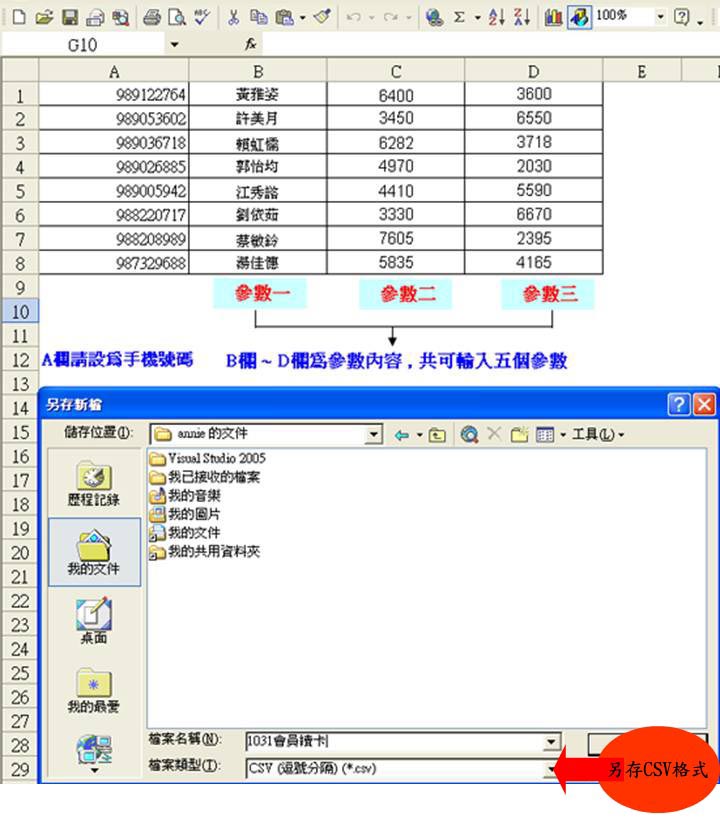 建立Excel檔案,編輯資料在檔案中輸入欲發送的參數內容 ◎A欄請設為手機號碼 ◎B欄 ~ F欄為參數內容 共可輸入五個參數 ◎編輯好客戶名單內容,記得要「另存新檔」副檔名為 .csv 檔 |