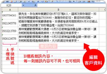建立一個Excel 檔,編輯客戶資料於檔案中 ◎A欄為手機號碼 ◎B欄為不同簡訊內容 ◎編輯好客戶名單內容,記得要「另存新檔」副檔名為 .csv 檔 ◎在發送頁面中按下 「瀏覽」並選取已存檔的 .csv 檔案 |