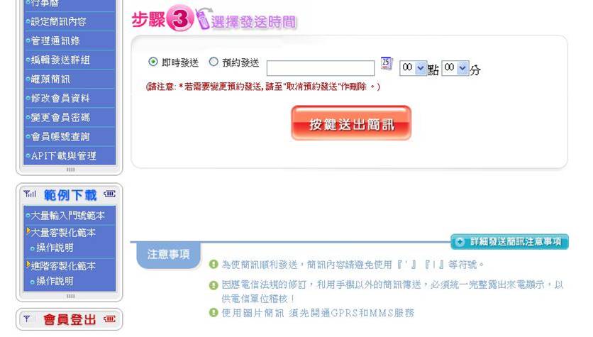 二、6.上述發送方式皆可設定為預約或週期性傳送。 可設定簡訊發送有效時間。 當客戶使用簡訊購發送簡訊時,若有設定預約發送時間,則將依預約發送時間作發送動作。 若未設定預約發送時間,將作即時發送。 |