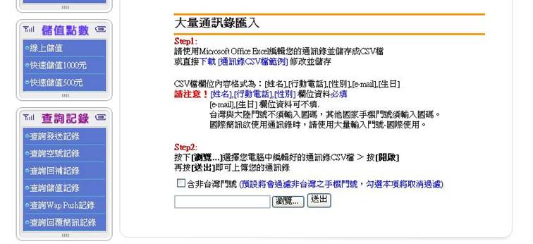 --新增聯絡人(大量新增,提供檔案資料匯入 ) 操作者可透過編輯CSV檔進行大量聯絡人上傳。 CSV檔所需欄位資料包含姓名、行動電話、性別、E-Mail、生日等 |