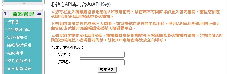 | API專用密碼(API KEY)設定 | ||||||